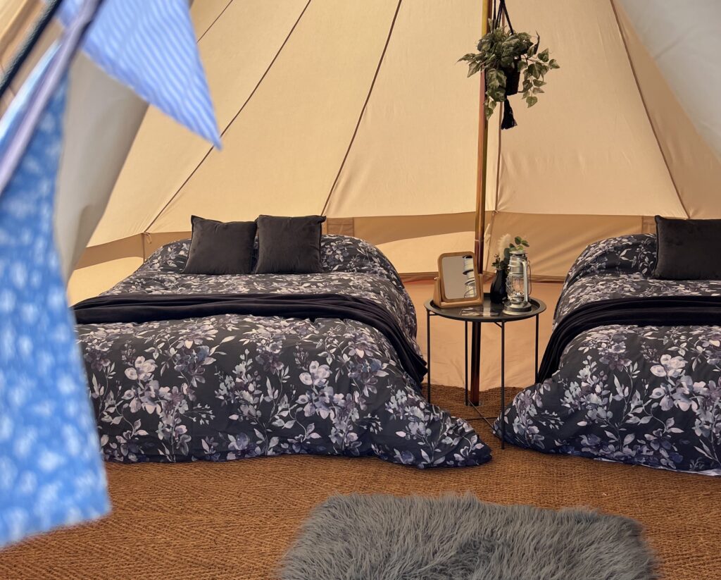 Furnished: floor matting, cozy camp beds, bedding (can bring your own), rug, table, door mat, exterior solar lights & interior battery lantern